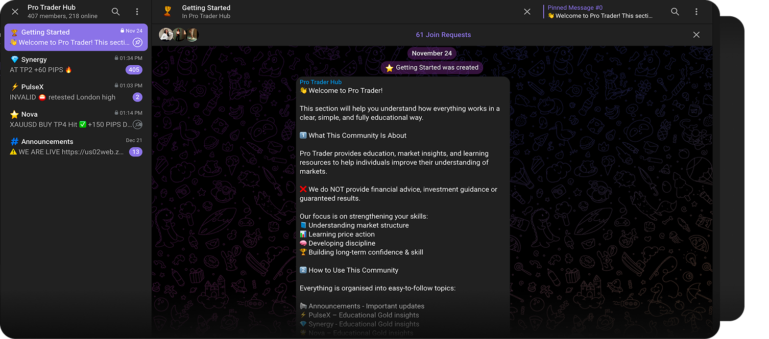 Most trading spaces are either overpriced courses or low-quality services. Pro Trader is different. A clean, structured, education-first platform backed by modern tools and a strong social trading community. We’re here to raise the standard.